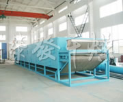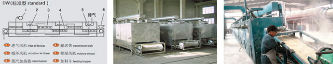 The materials a re uniformly distributed on the mesh-belt by the material feeder. The mesh-belt generally adopts 12-60 mesh stainless steel mesh and it is drawn by a transmission device and move inside the dryer . The dryer is composed of several sections. For each section, the hot air is circulated separatel y. Part of exhausted gas is exhausted by a special moisture exhaust blower. The waste gas is controlled by an adjustment valve. The hot a ir passes through the mesh-belt covered with bring water material away. The mesh-belt moves slowly, running speed can be freely adjusted according to the material property. The final products after the drying process will fall into the material collector continuously. The top a nd low circulation units can be freely equipped according to the user’s requirements. The number of section might be selected